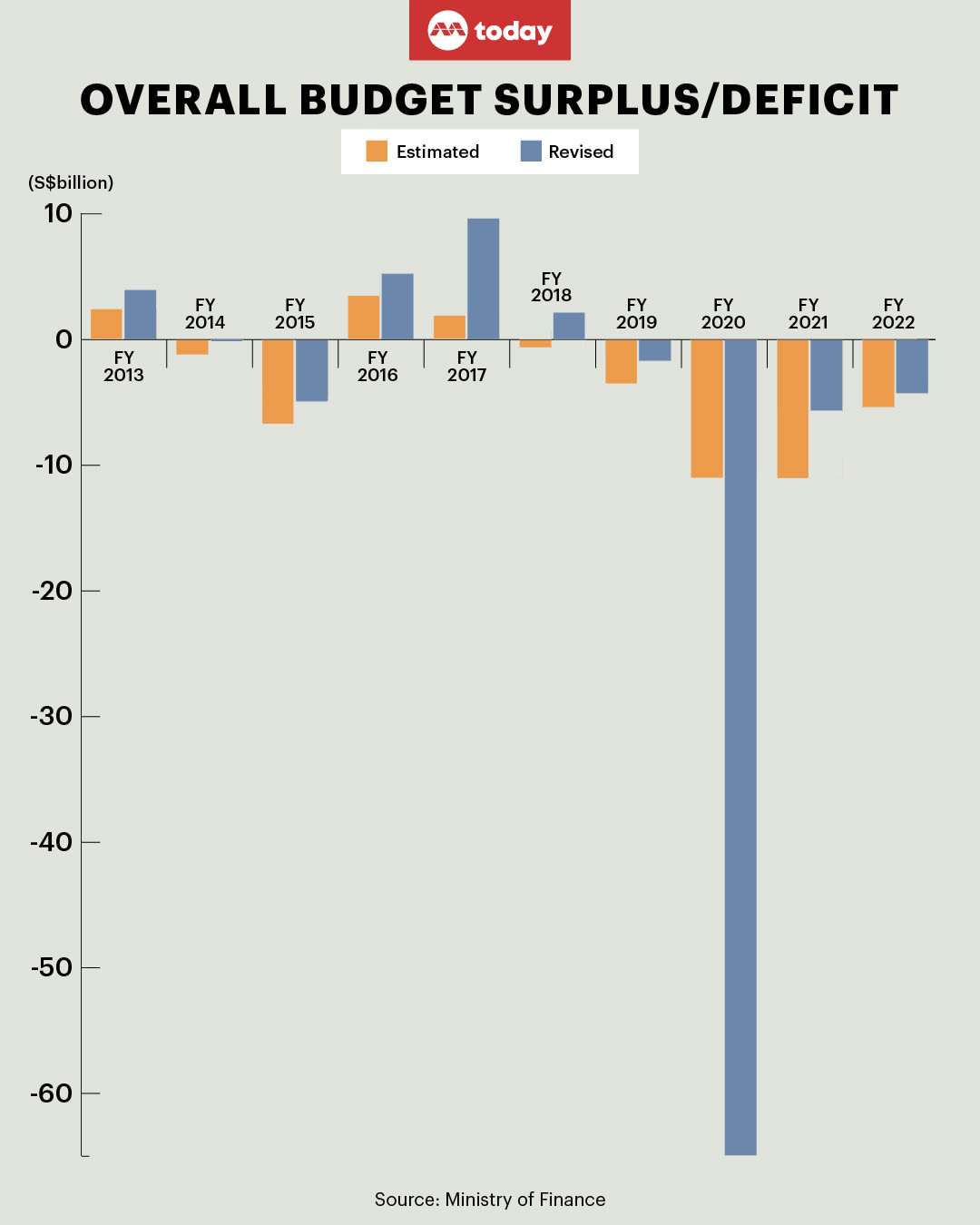 In that year, the estimated deficit was S$10.95 billion while the revised deficit turned out to be a whopping S$64.9 billion. That initial estimate was made when the Budget was delivered in February 2020, before the full economic impact of the pandemic was clear.