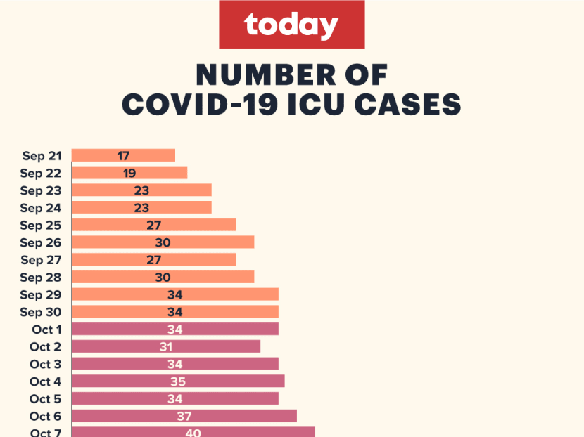 The total number of cases warded in ICU has steadily increased from 17 cases on Sept 21, to 27 cases on Sept 27 when the stabilisation measures were implemented, to 67 cases on Monday. This went up to 71 on Tuesday, as Singapore logged a record 3,994 new Covid-19 infections.