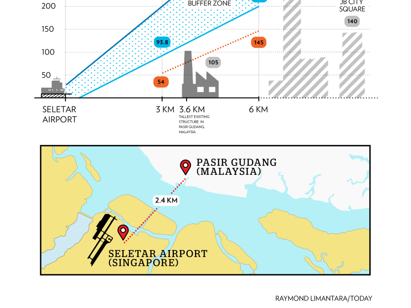 Right now, the tallest structure in Pasir Gudang is 105m tall and is located 3.6km from Seletar Airport. So, it falls under the height restriction. These height restrictions can be further adjusted if required.