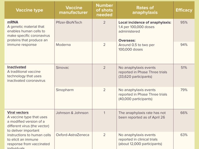 In an April 18 safety update by HSA, it was stated that the incidence rate of anaphylaxis reported here with Pfizer-BioNTech and Moderna vaccines is about 1.4 for every 100,000 doses administered.