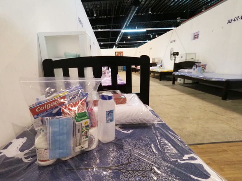 Packages containing items for daily use are placed on beds at the Changi Exhibition Centre, which has been repurposed into a community care facility for Covid-19 patients with mild symptoms. Photo: Raj Nadarajan/TODAY