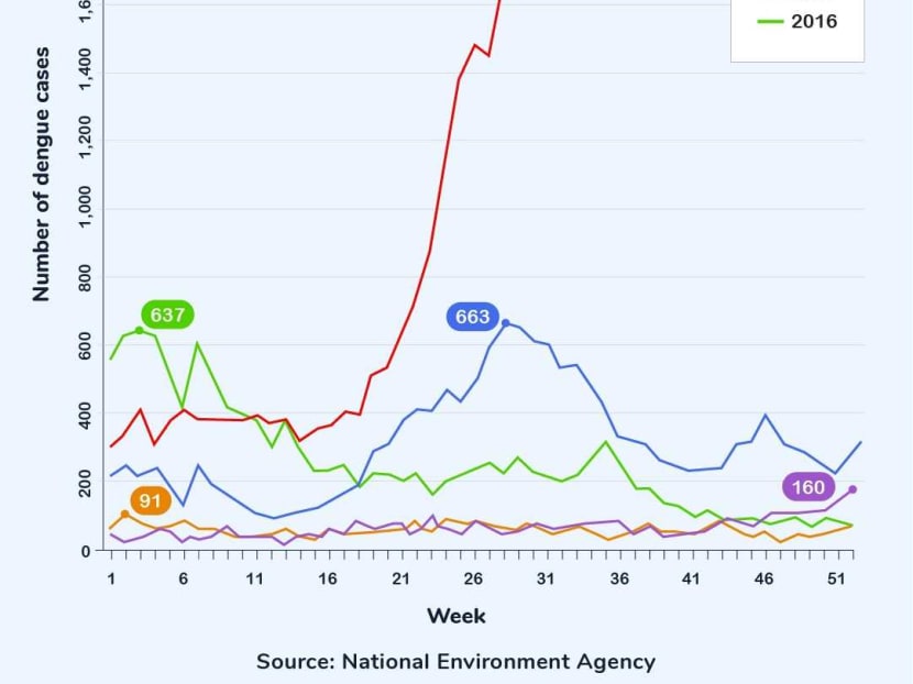 A graph showing the sharp rise in dengue cases in Singapore so far in 2020 compared with recent years. Illustration: Samuel Woo/TODAY