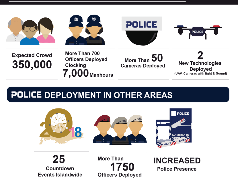 At the Marina Bay countdown event, which is expecting a crowd of 350,000, more than 700 security officers will be deployed, while over 50 police cameras will be used.