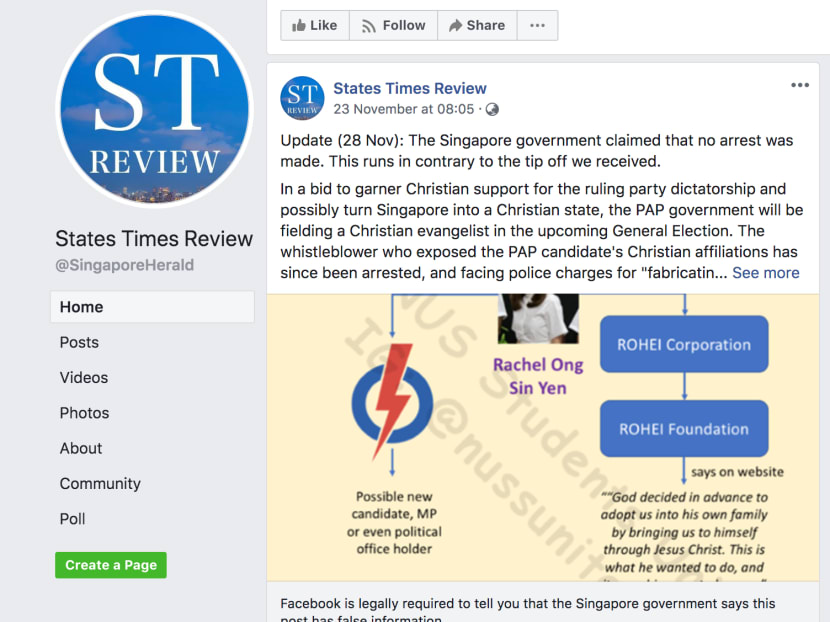 SINGAPORE — Facebook has issued a correction notice for a States Times Review Facebook post in a first for the platform, after it was instructed to do so on Friday (Nov 29) by the office overseeing the Protection from Online Falsehoods and Manipulation Act.