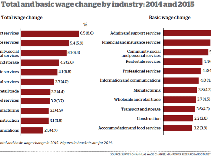 The bright spots were in administrative and support services; financial and insurance services; and community, social and personal services, which saw the biggest growth in wages, similar to 2014. Total wage growth in these sectors ranged from 5.1 per cent to 6.5 per cent.