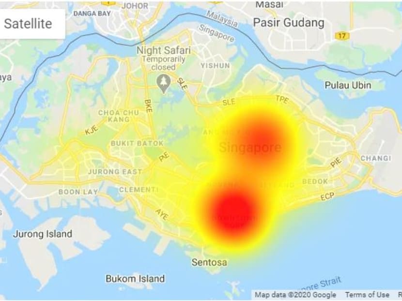 An outage map on the Down Detector website shows problems with the StarHub network at about 5.50pm on April 15, 2020. Source: Downdetector