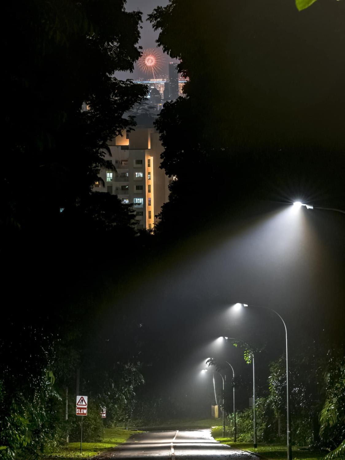 In the photo shared by Facebook user Quek Song Chye, a singular red firework rising over Marina Bay Sands hotel is captured through a gap in a canopy of trees. In contrast, the photo’s foreground reveals a dark and deserted road illuminated only by some street lights.