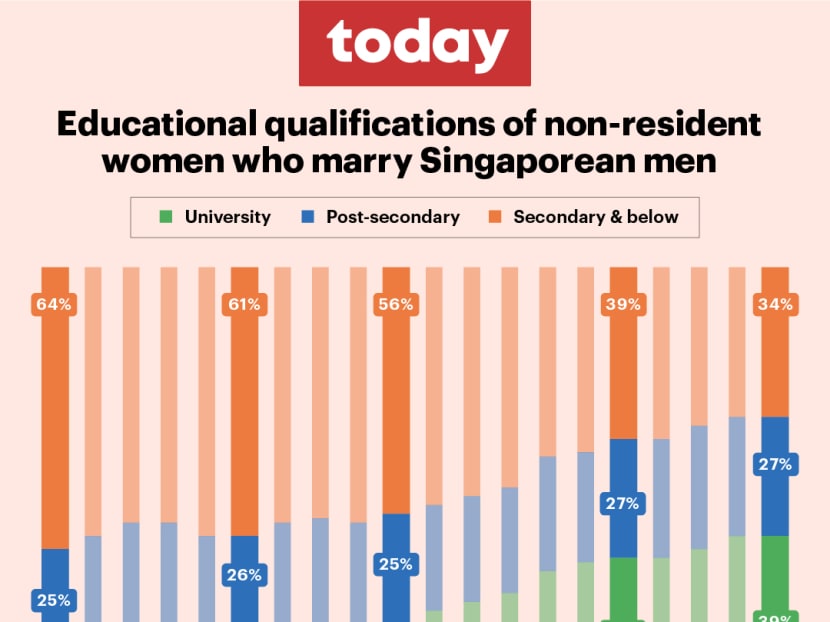 SINGAPORE — Foreign brides who marry Singaporean men are becoming older and better educated than in the past, based on data released on Thursday (April 22) by the Ministry of Social and Family Development (MSF).