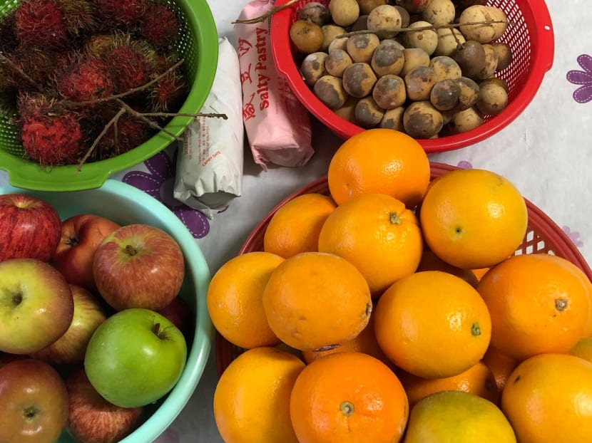 Fruits are a common food offering and oranges formed the bulk of the group’s haul. They also bagged other fruits such as apples, pineapples and rambutans — albeit in much smaller numbers.