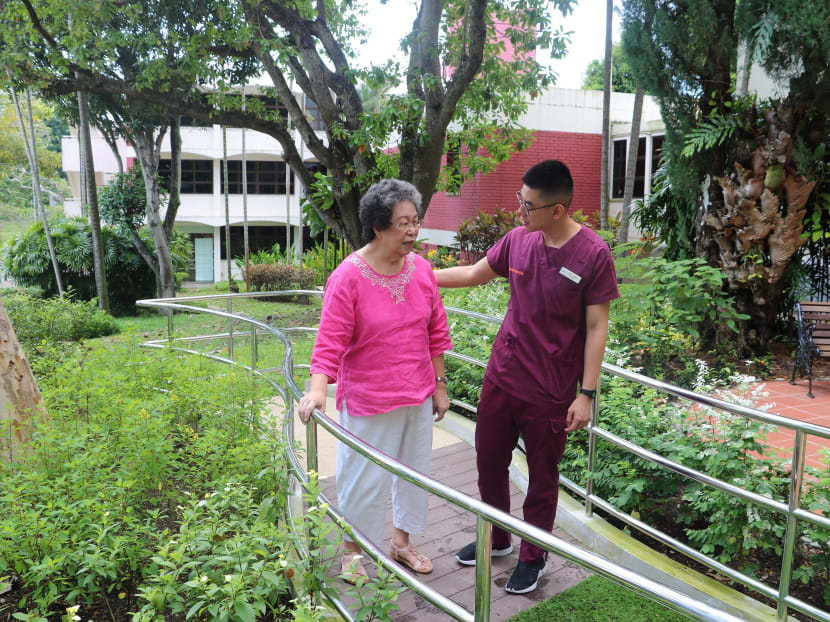 There, Mdm Ho enjoyed having physiotherapy sessions outdoors, where she had to slowly start to walk again along the garden’s mobility track.