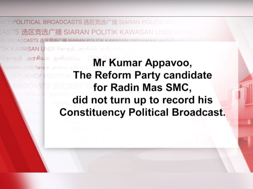 SINGAPORE — The People’s Action Party (PAP) candidate contesting Radin Mas Singapore Member Constituency (SMC) outlined his plans for the ward in a constituency political broadcast on Tuesday (July 7) but his opponent, the Reform Party’s (RP) candidate Kumar Appavoo, did not turn up for the recording.