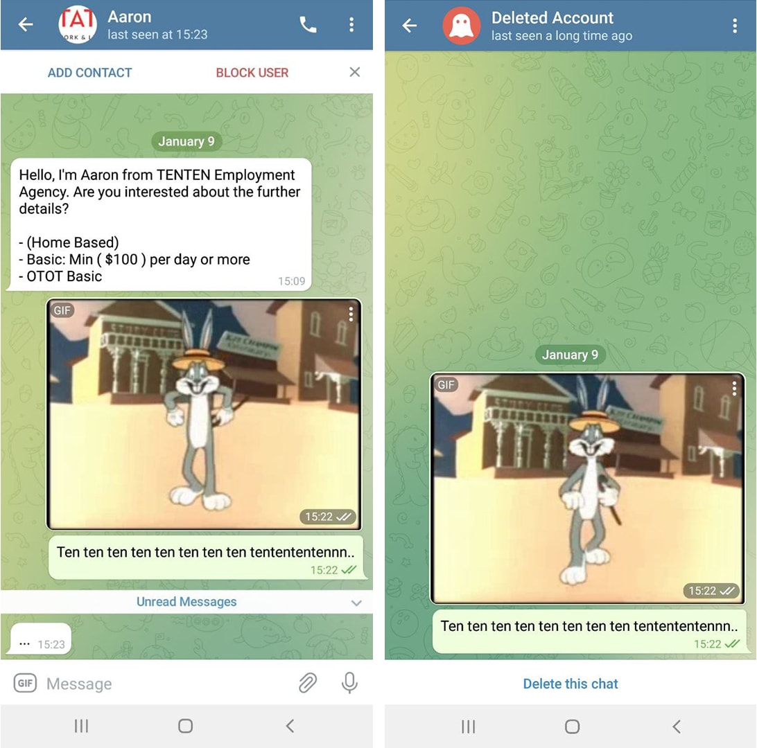 I got my first "job offer" through a Telegram message from “Isabel”. After I responded to it, someone who identified himself as "Chong" texted me on WhatsApp.
