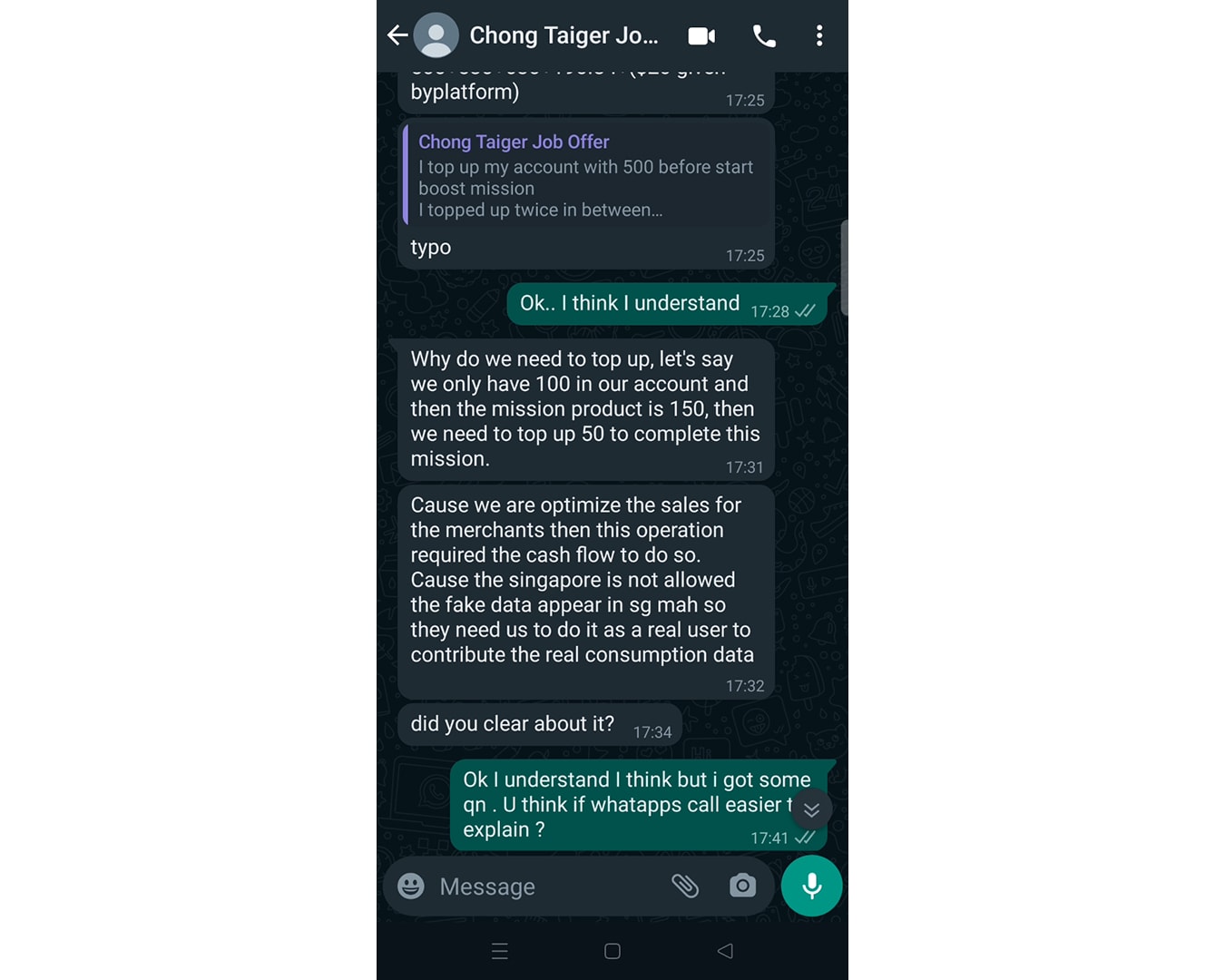 Red flag #3: Chong gave me a brief job description over text message, promising me a ridiculously generous commission of up to S$125 from working just an hour a day from home.