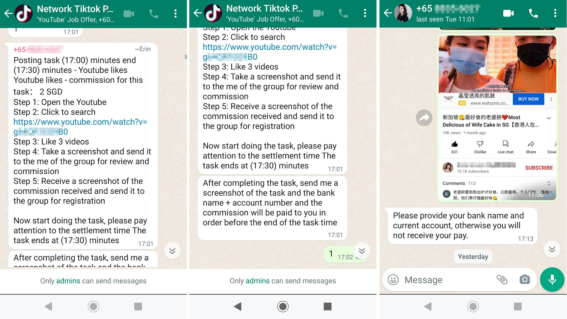 I accepted the offer and was brought into a WhatsApp chat group, where an administrator gave instructions for the task, which involved clicking "like" on three YouTube videos.