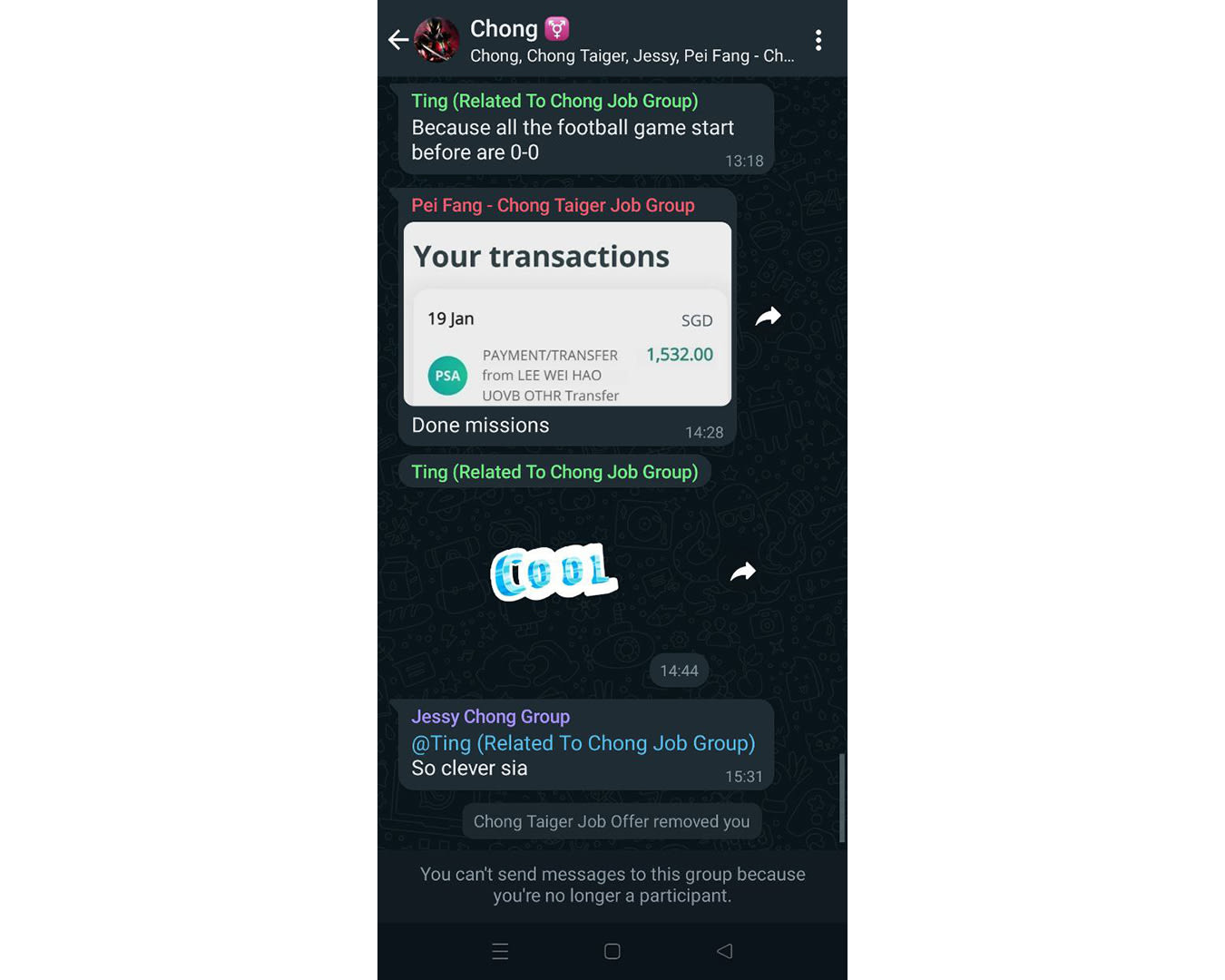 In the meantime, Chong added me into a WhatsApp chat group with other “agents” who shared screenshots of their supposed earnings. One of them, identifying himself as Xing, even sent me personal messages initiating small talk.