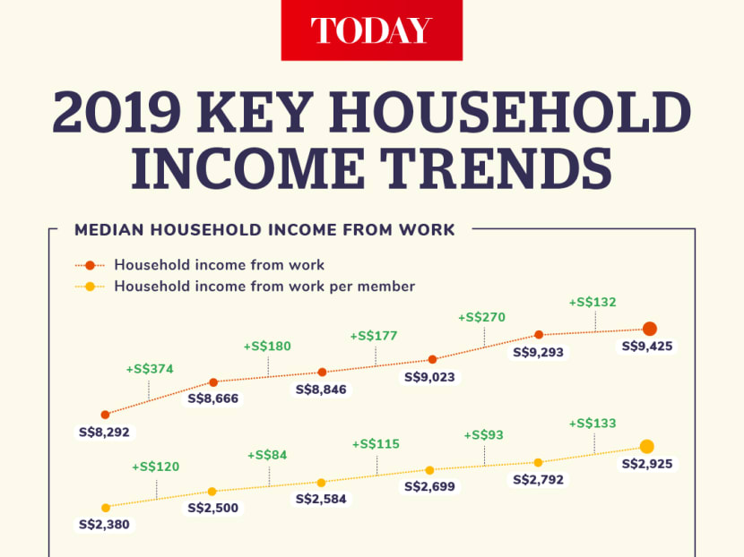 The median monthly household income from work among resident employed households grew by 1.4 per cent in nominal terms, or 1 per cent in real terms, from S$9,293 in 2018 to S$9,425 in 2019.