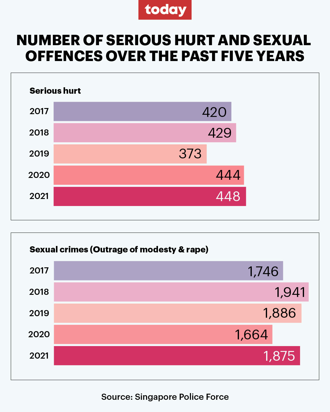 Data from the Singapore Police Force showed that the number of serious hurt and sexual offences has generally remained stable from 2017 to 2021.