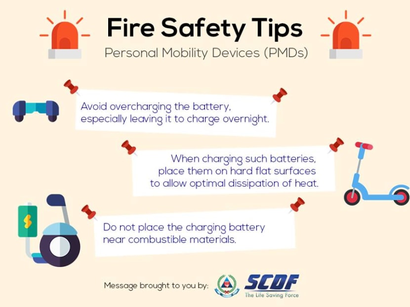The SCDF warned users of personal mobility devices such as electric bicycles to take steps not to overcharge the vehicle’s battery and avoid charging them overnight. It added that the batteries should not be placed near combustible materials while charging.