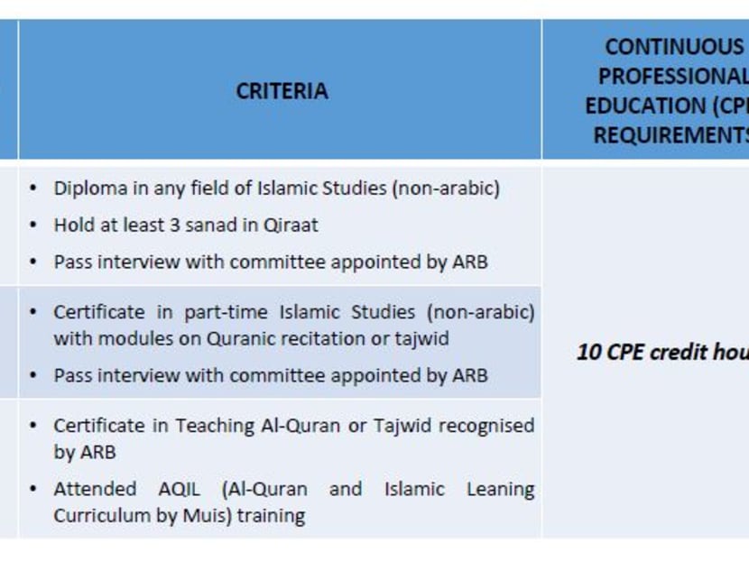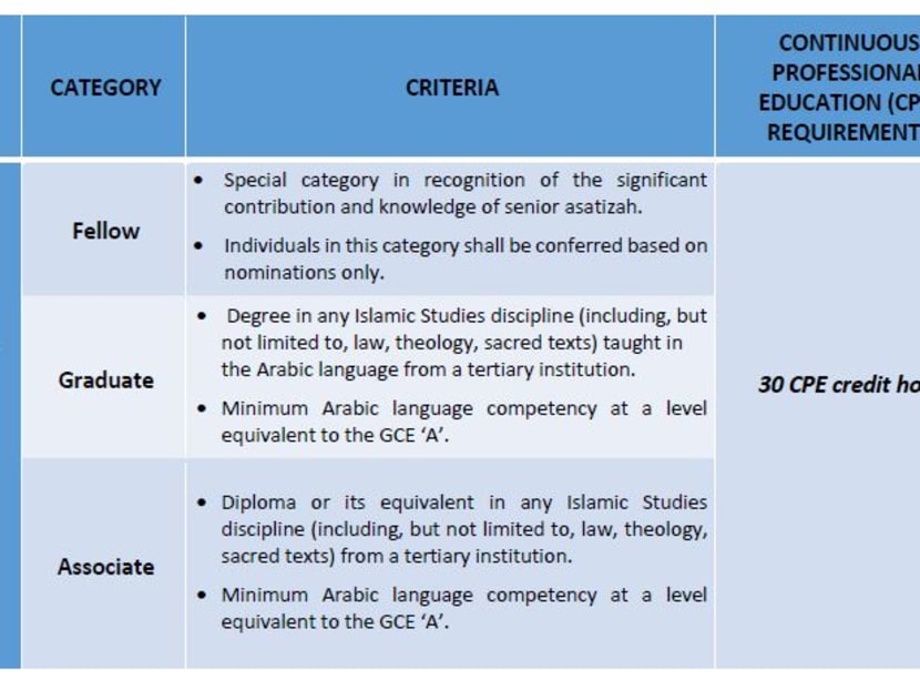 Under these standards — split into two tiers, one for asatizah and another for Quranic teachers — asatizah will need to undergo at least 30 credit hours of continuous professional education (CPE) modules in three years. These include skills-based courses such as counselling, as well as content-based modules such as sociology of religion. Quranic teachers will need to undergo at least 10 credit hours of CPE over the same period of time.