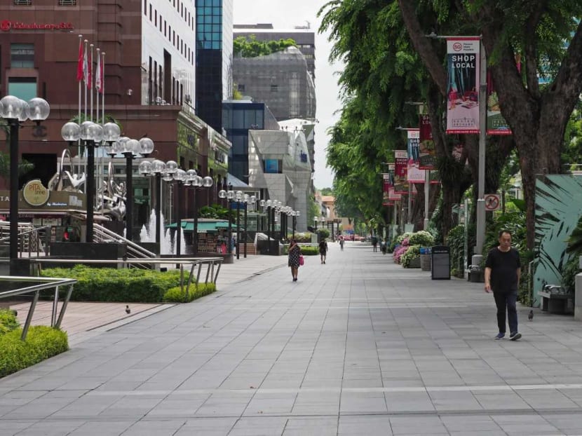Orchard Road at about 2pm on April 7, 2020, the first day most people in the country have to stay home or work from home. Photo: Raj Nadarajan/TODAY