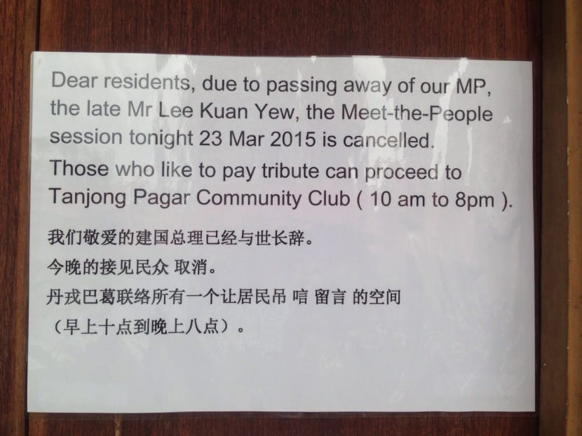 3.29pm: Spotted: A notice was put up at Block 5, Tanjong Pagar Plaza, informing residents that the MPS session yesterday (March 23) was cancelled due to Mr Lee's passing.