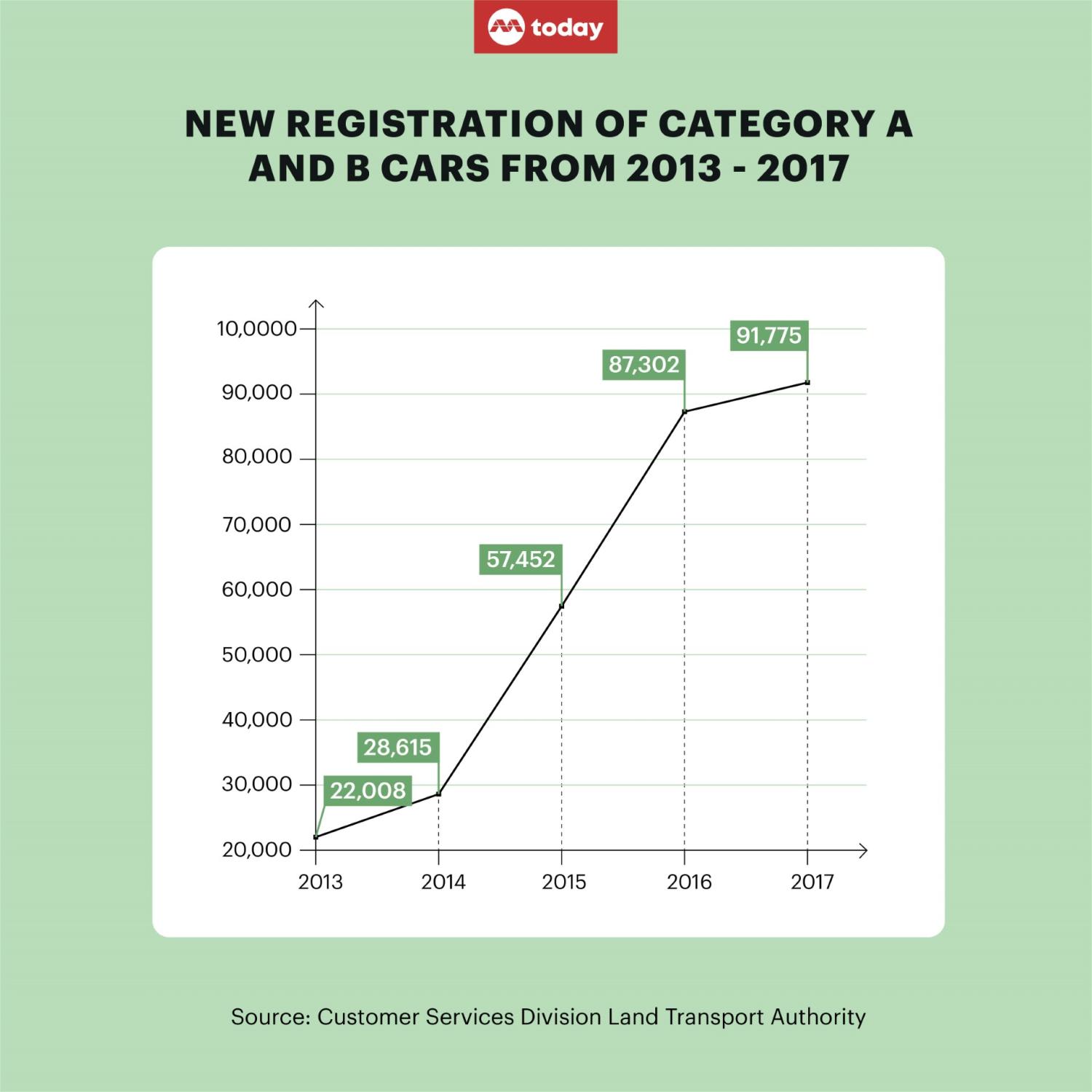 New registrations of Category A and Category B — for smaller and larger cars, respectively — totalled 28,615, a 30 per cent increase from the previous year’s total of 22,008.