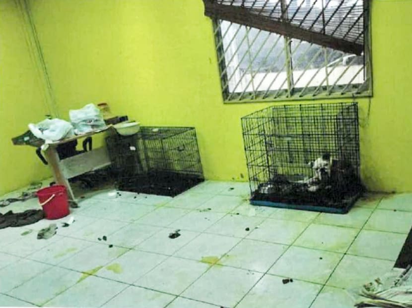 On July 17 last year, an employee from the National Parks Board (NParks) conducted an inspection at the farm. He heard the sound of an animal whining from a room and found the malnourished dog in a cage there.