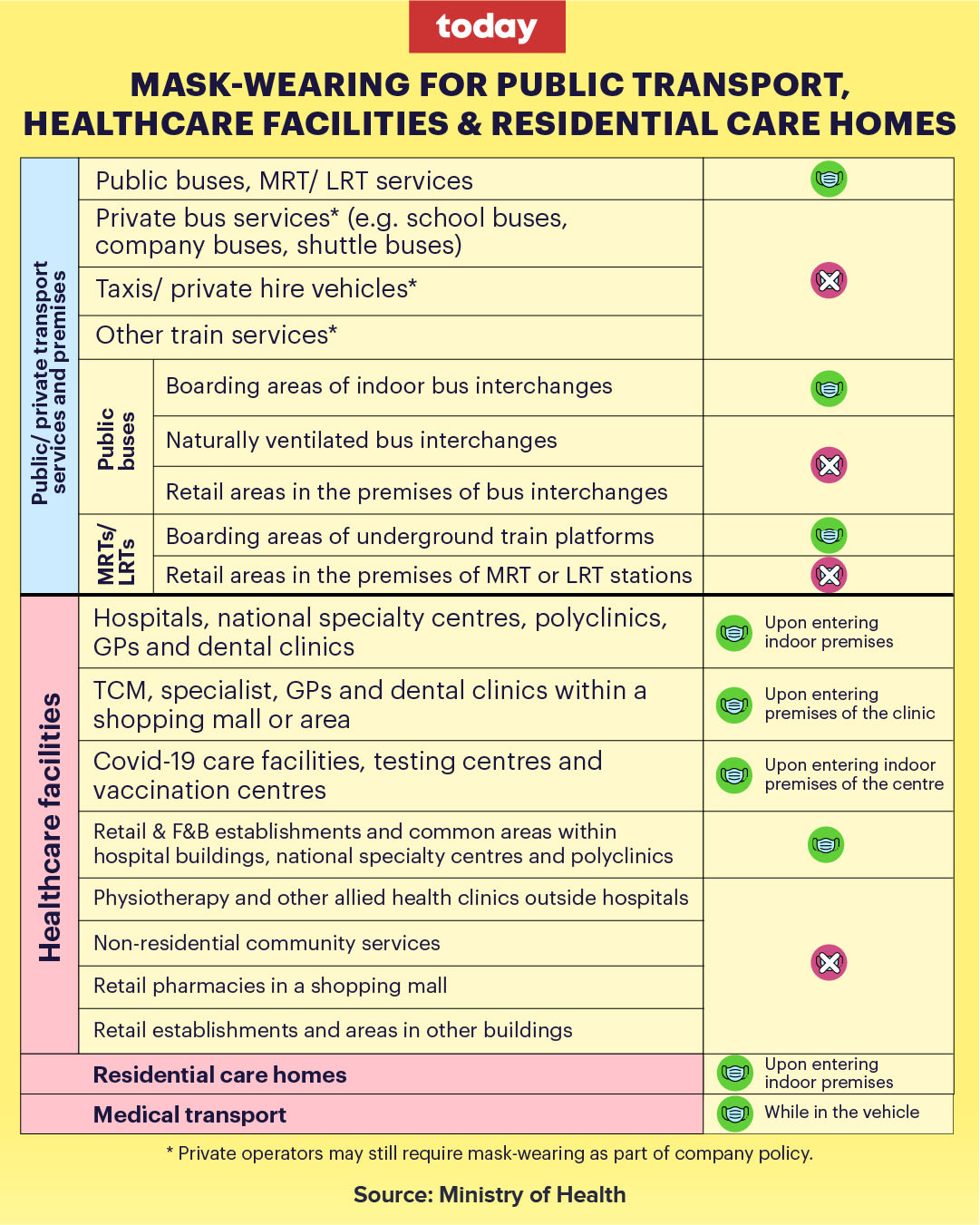 However, face masks will still be required on public transport such as public buses and MRT trains, and in indoor public transport facilities such as boarding areas, as well as in places where essential services are carried out in enclosed and crowded areas that are frequently used by vulnerable persons.