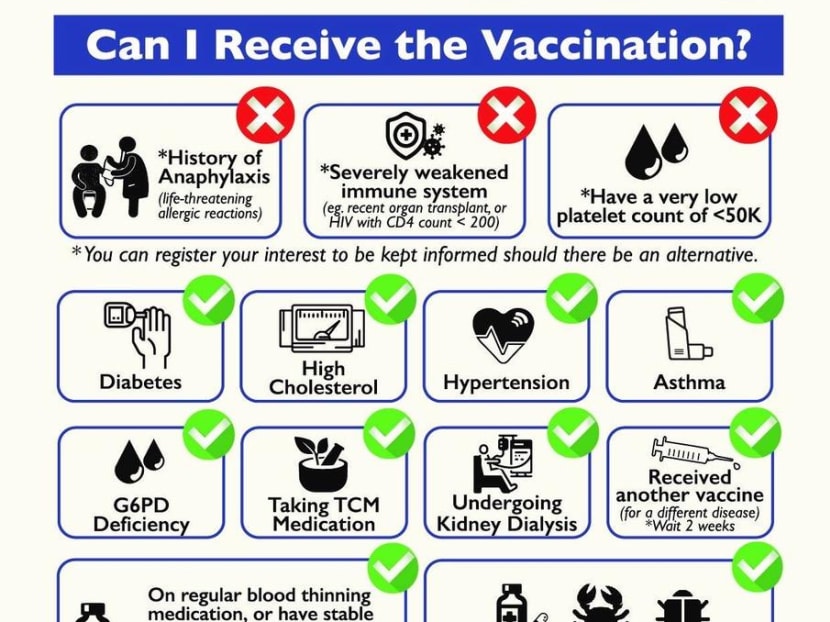 As for those with active cancer, MOH said on its website that those who are not on treatment with chemotherapy, radiotherapy or immunotherapy can be vaccinated.