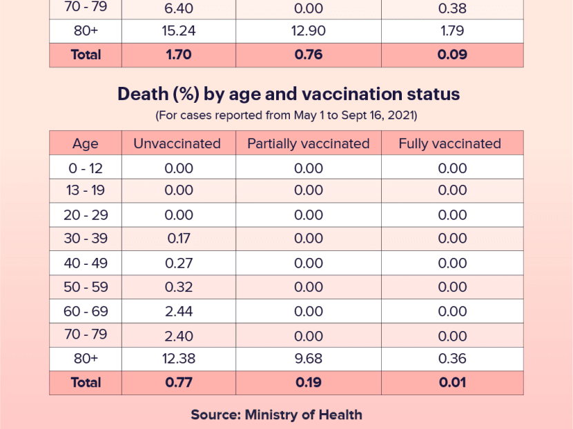 Mr Ong said: "A fully vaccinated person in his/her 70s has better chances of not falling very sick as an unvaccinated person in his/her 30s (0.38 per cent vs 0.84 per cent).