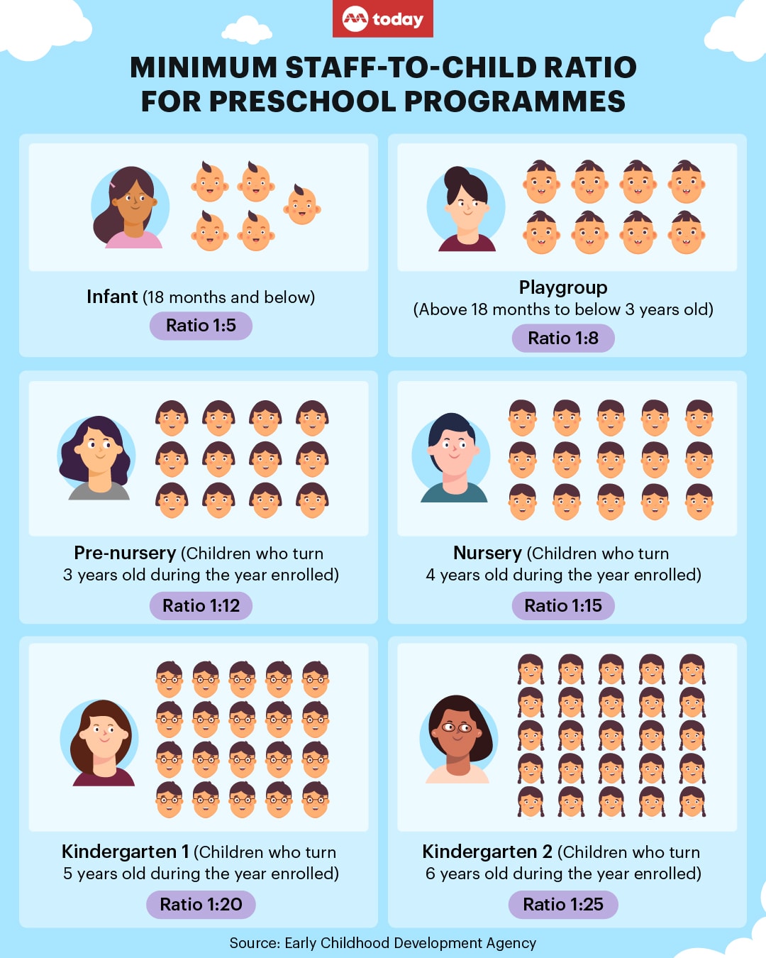 For instance, private preschool operator MapleBear implements a strict 1:10 staff-to-child ratio for its kindergarten programme, whereas ECDA mandates a 1:20 ratio for kindergarten 1, and 1:25 for kindergarten 2 classes.