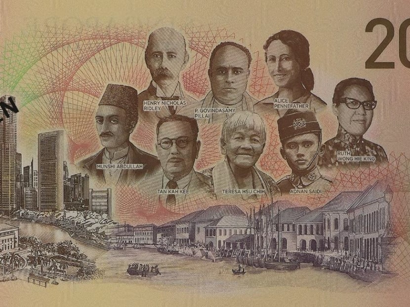 The back of the S$20 commemorative note features eight pioneers who made signficant contributions to Singapore in various fields. Photo: Monetary Authority of Singapore