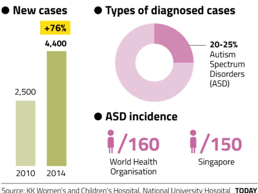 Latest figures provided by the KK Women’s and Children’s Hospital (KKH) and the National University Hospital (NUH) — the two public healthcare institutions which screen and treat children aged six and below for issues including development delays, speech and language delays, learning difficulties and autism spectrum disorders (ASD) — showed a 76 per cent jump in cases between 2010 and 2014.