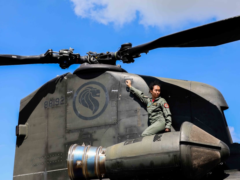 Captain Trixie Tang Yingsi from RSAF inspecting the CH-47 Chinook helicopter at Sembawang Air Base on July 16, 2020. Photo: Ili Nadhirah Mansor/TODAY