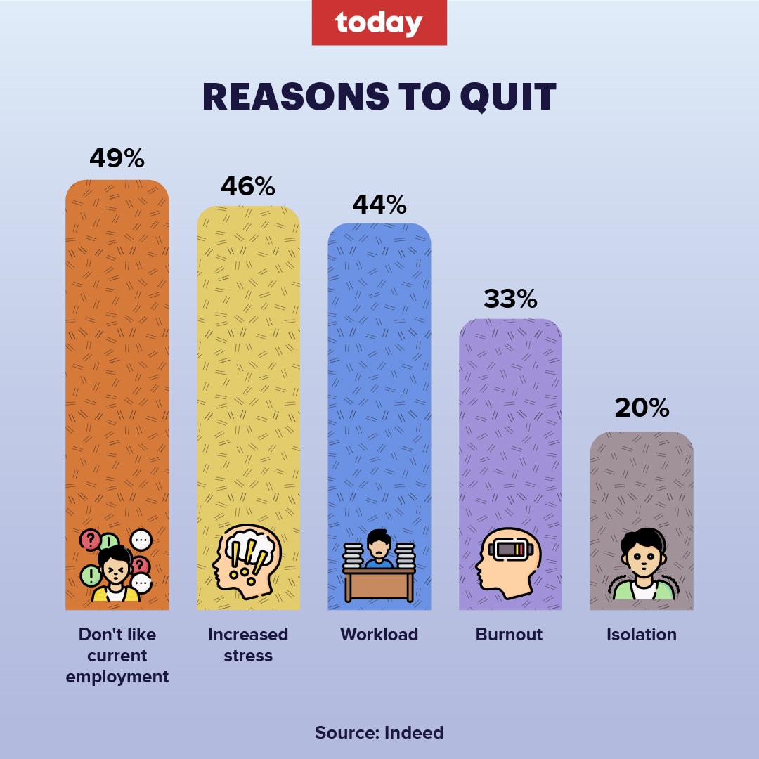 The pandemic had led to 49 per cent of employees realising that they do not like their current job, 46 per cent pointing to increased stress levels, 44 per cent saying that there were heavier workloads, 33 per cent experiencing more burnout and 20 per cent feeling isolated.