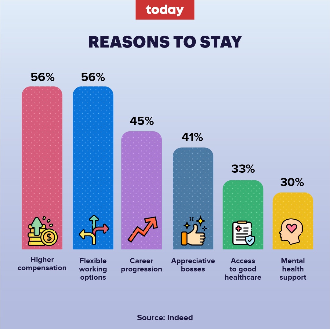 For Singapore to avoid this phenomenon, higher salaries, greater flexibility and opportunities for career progression have been picked by the survey respondents as the main reasons for them to want to stay in their jobs.