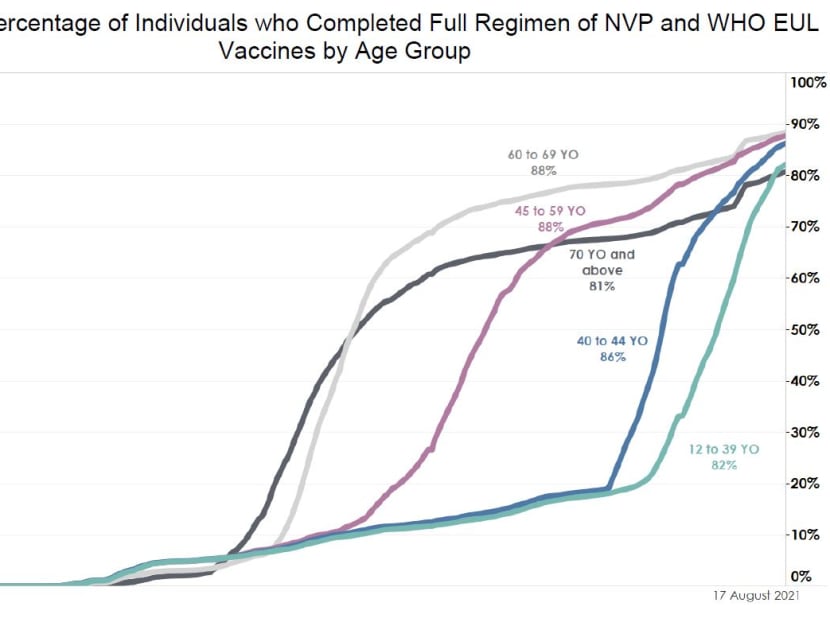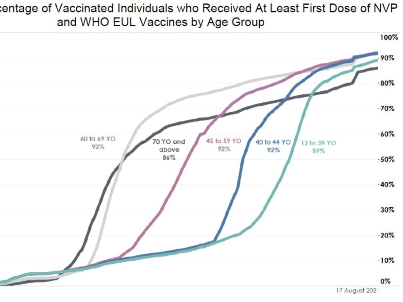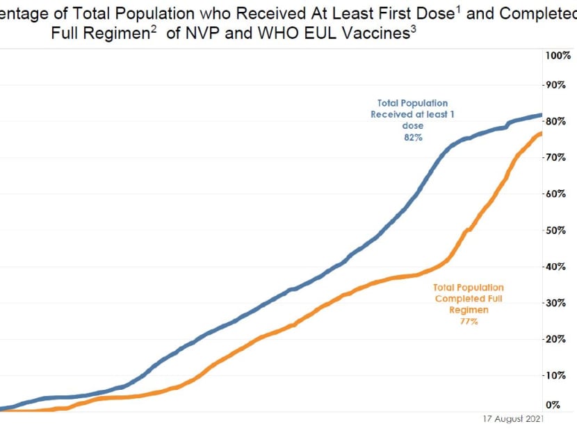 As of Aug 17, 77 per cent of the population had completed their full regimen or received two doses of Covid-19 vaccines, and 82 per cent had received at least one dose.