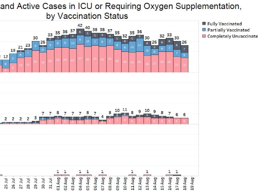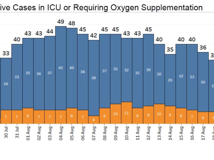 SINGAPORE — The number of Covid-19 patients who are in serious condition and need oxygen support to help them breathe has dropped to 26 on Wednesday (Aug 18), down from 30 the day before.