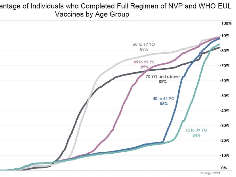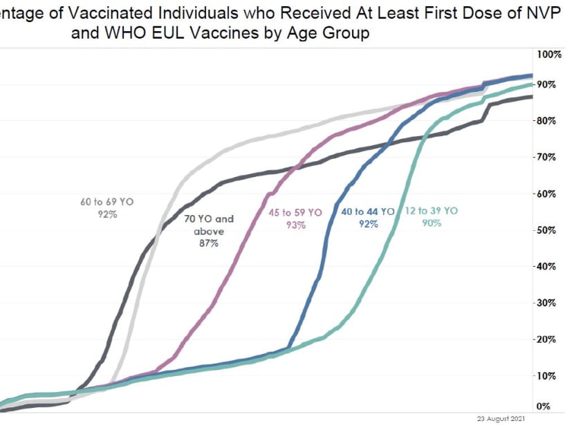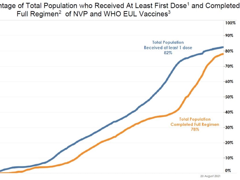 As of Aug 23, 78 per cent of the population had completed their full regimen or received two doses of Covid-19 vaccines, and 82 per cent had received at least one dose.