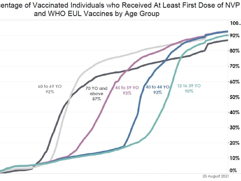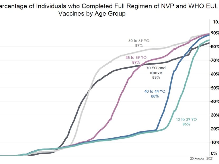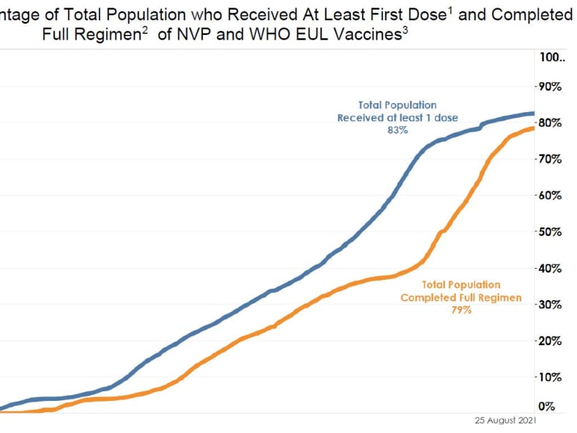 As of Aug 25, 79 per cent of the population had completed their full regimen or received two doses of Covid-19 vaccines, and 83 per cent had received at least one dose.