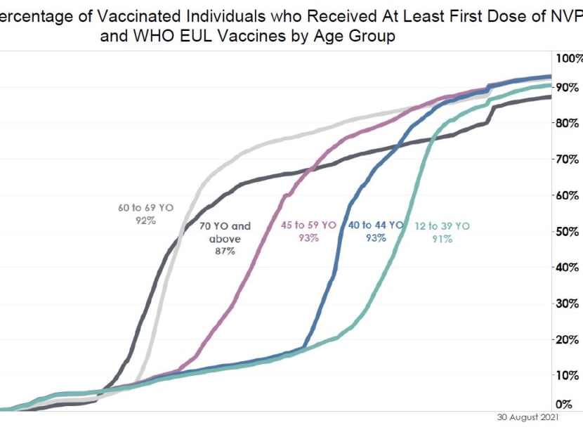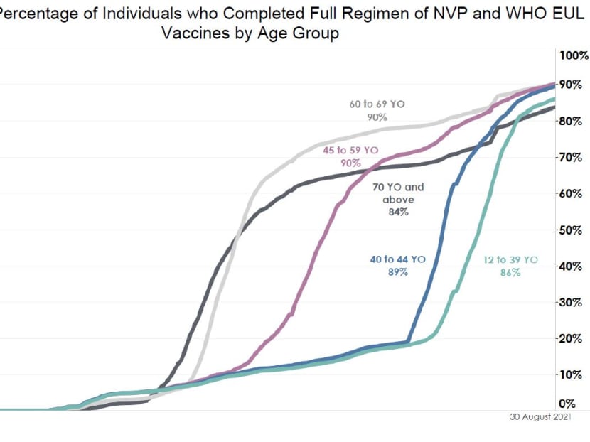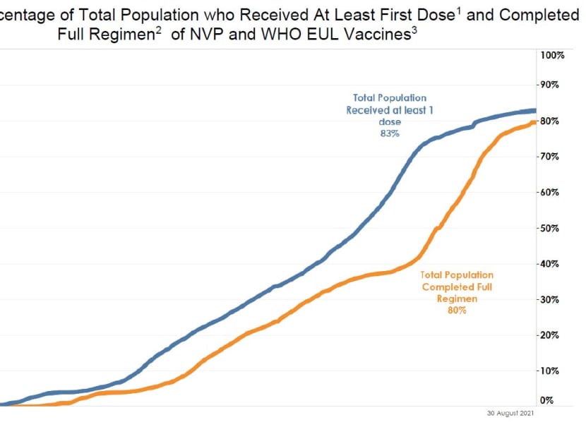 As of Aug 30, 80 per cent of the population had completed their full regimen or received two doses of Covid-19 vaccines, and 83 per cent had received at least one dose.