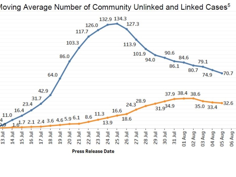 The seven-day moving average number of all linked community cases and all unlinked community cases are 70.7 and 32.6 respectively, MOH said.