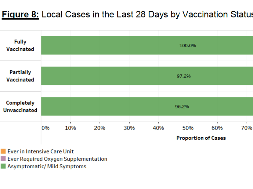 Over the last 28 days, 11 local cases required supplemental oxygen, were admitted to an intensive care unit or died. Seven were notvaccinated, four were partially vaccinated and none were fully vaccinated.