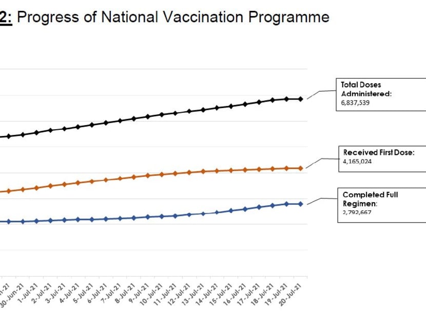 About 6.84 million doses of Covid-19 vaccines had been given to more than 4.16 million people as of Tuesday, MOH said.