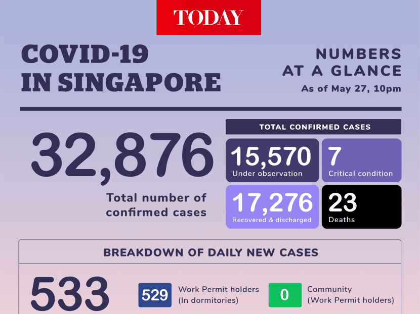 SINGAPORE — The Ministry of Health (MOH) on Wednesday (May 27) said that it had identified a new cluster of infections at a dormitory located at 38 Tuas View Square, confirming as well that there are 533 new cases of Covid-19 on the day.