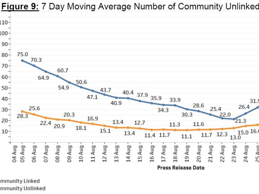 The seven-day moving average number of all linked community cases and all unlinked community cases is 84.6 and 36.1 respectively.