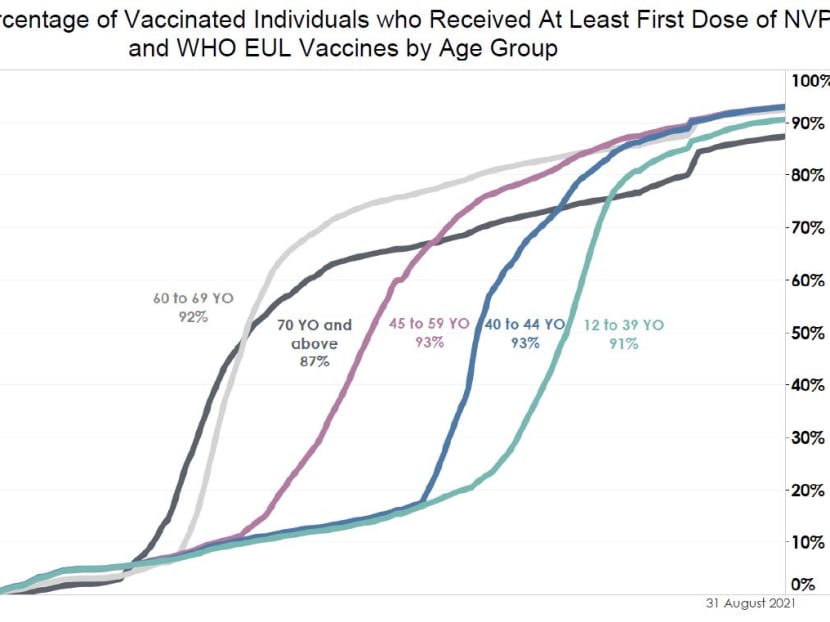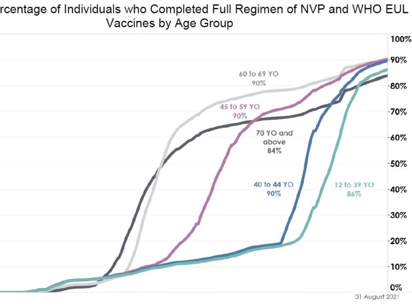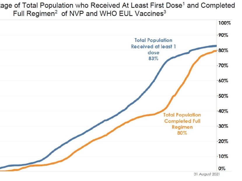 As of Aug 31, 80 per cent of the population had completed their full regimen or received two doses of Covid-19 vaccines, and 83 per cent had received at least one dose.