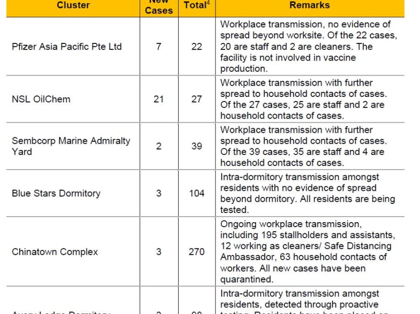 MOH said that the cluster at Pfizer Asia Pacific, which is not involved in vaccine production, has 22 cases after seven were added.
