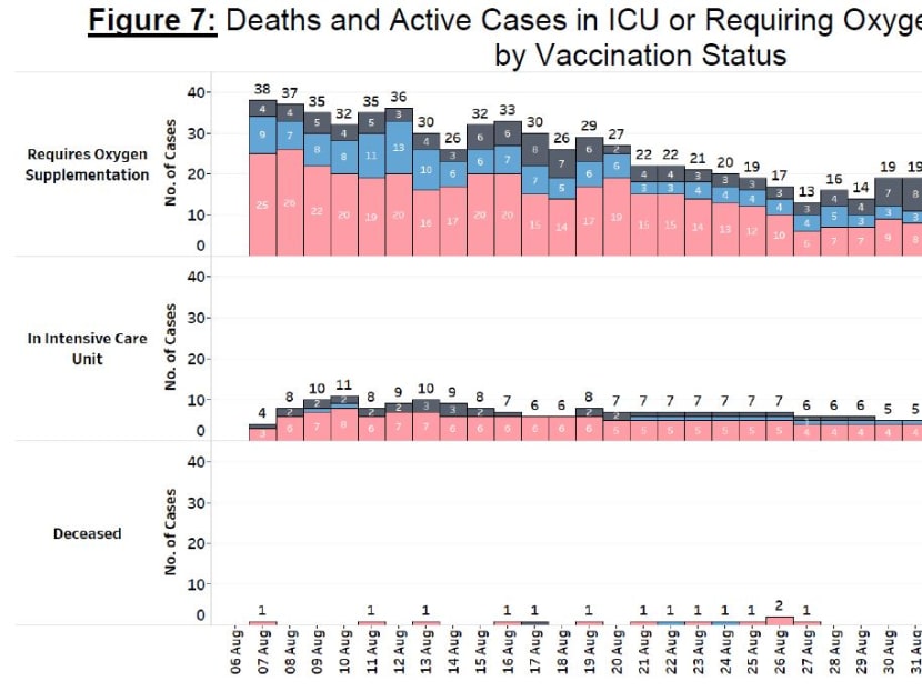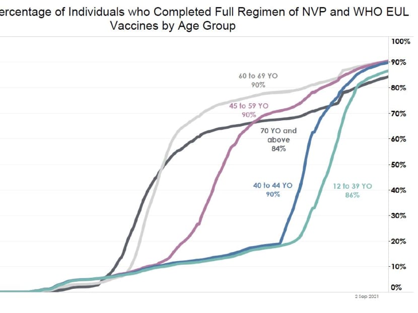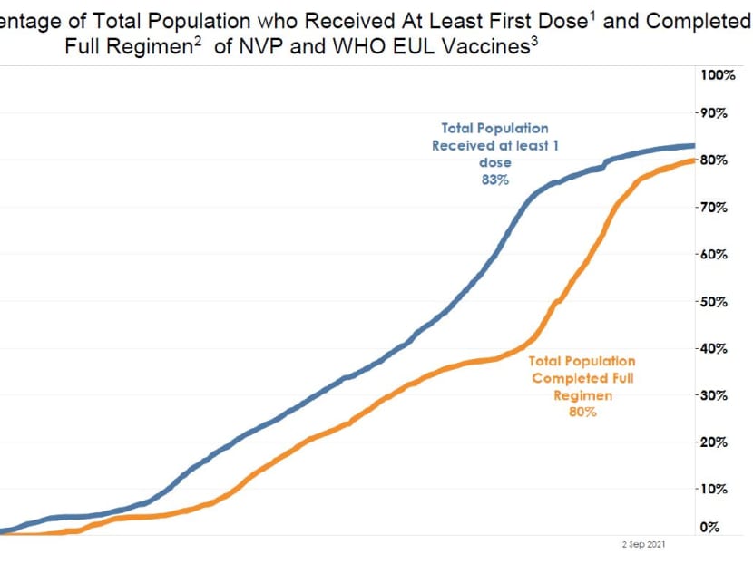 As of Sept 2, 80 per cent of the population had completed their full regimen or received two doses of Covid-19 vaccines, and 83 per cent had received at least one dose.
