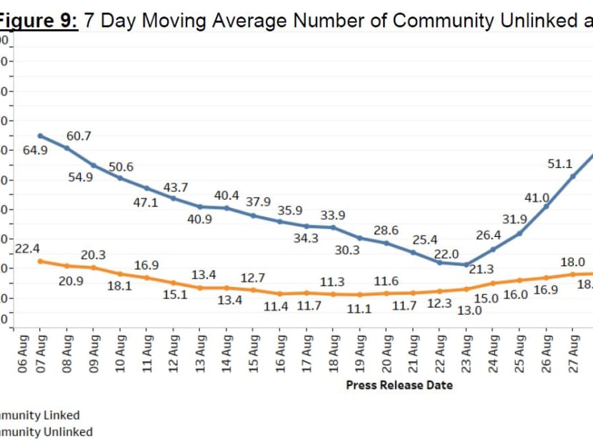 The number of unlinked cases in the community has also more than tripled from 126 in the week before to 401 in the past week.